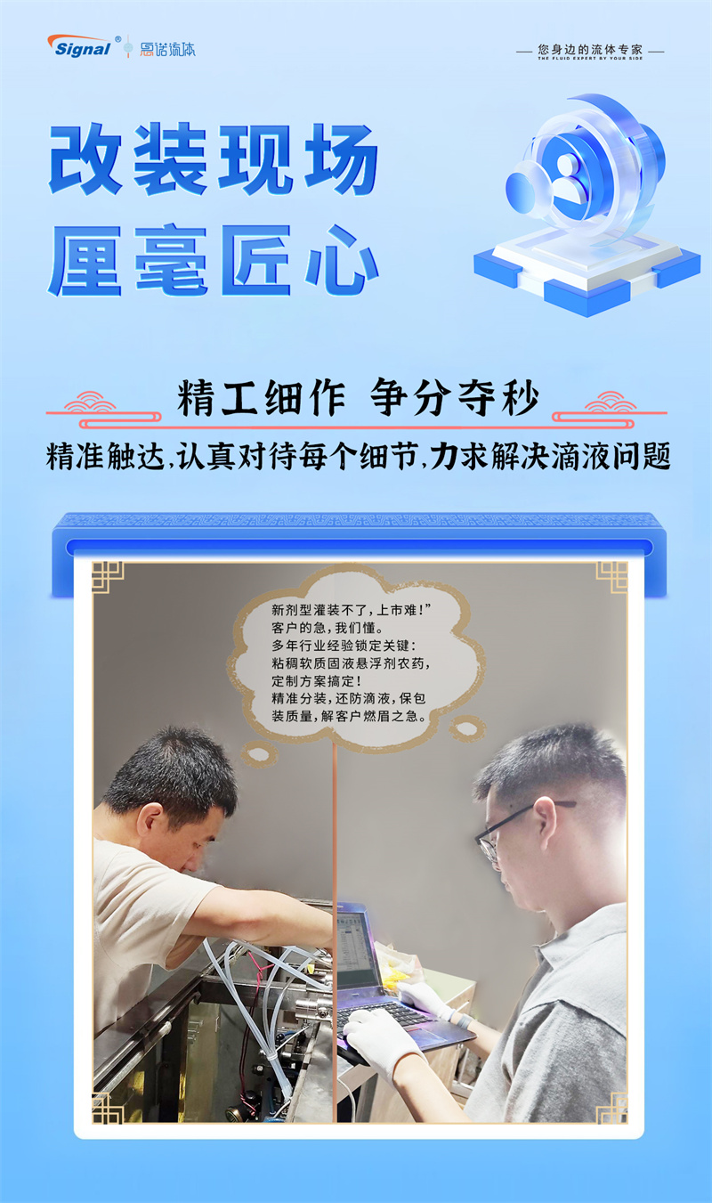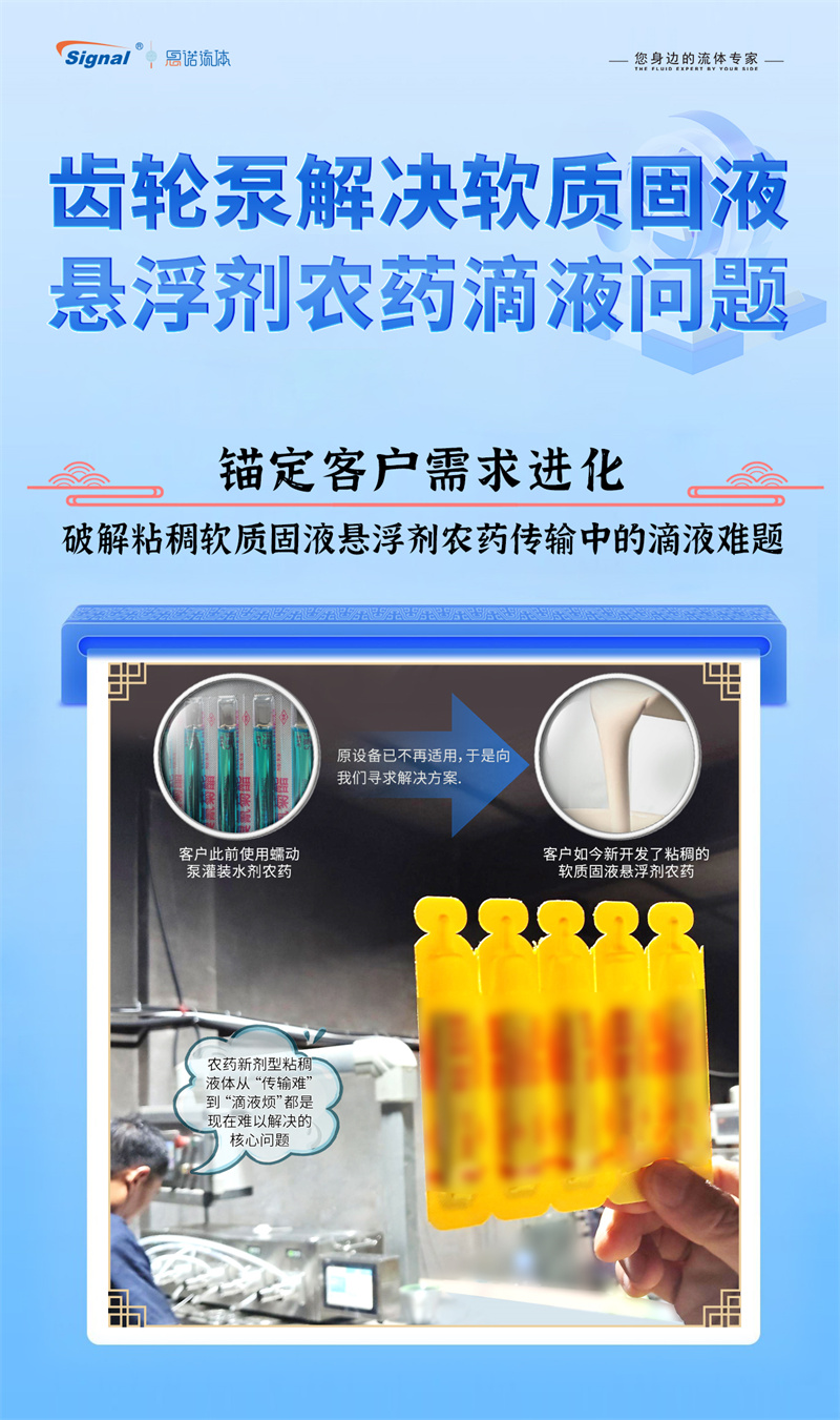 一位長期使用我司蠕動泵灌裝水劑農藥的老客戶,因新開發粘稠的軟質固液懸浮劑而面臨設備瓶頸,我們迅速響應,為其量身推薦了更優解決方案——高性能齒輪泵灌裝系統。
