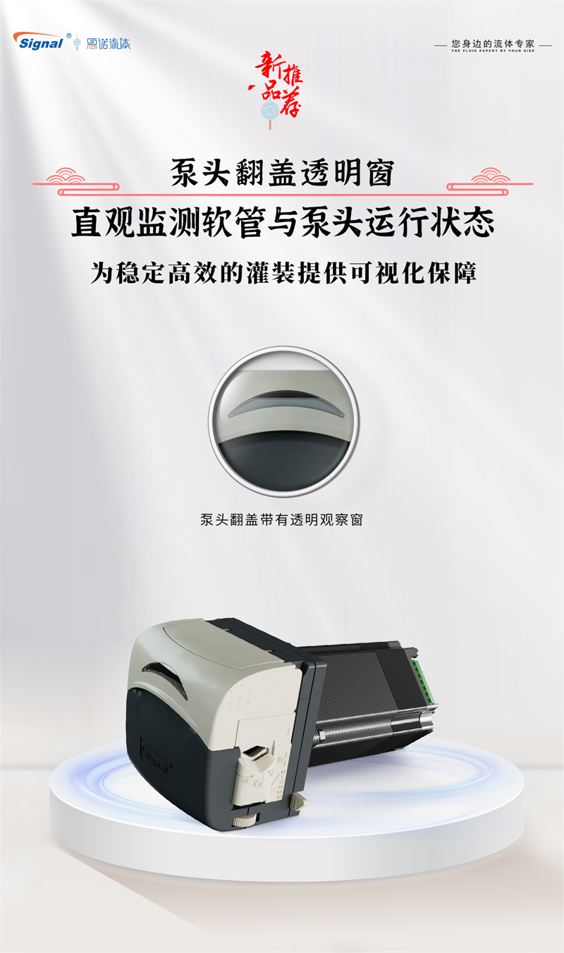 2.?透明視窗,運(yùn)行可視: 創(chuàng)新設(shè)計(jì)透明觀察窗口,讓您能夠?qū)崟r(shí)、直觀地監(jiān)控泵內(nèi)軟管運(yùn)行狀態(tài)及流體傳輸情況,操作更安心。