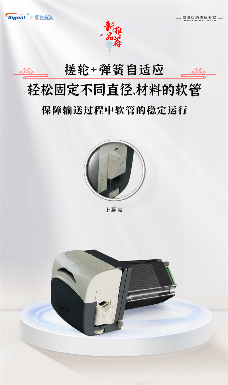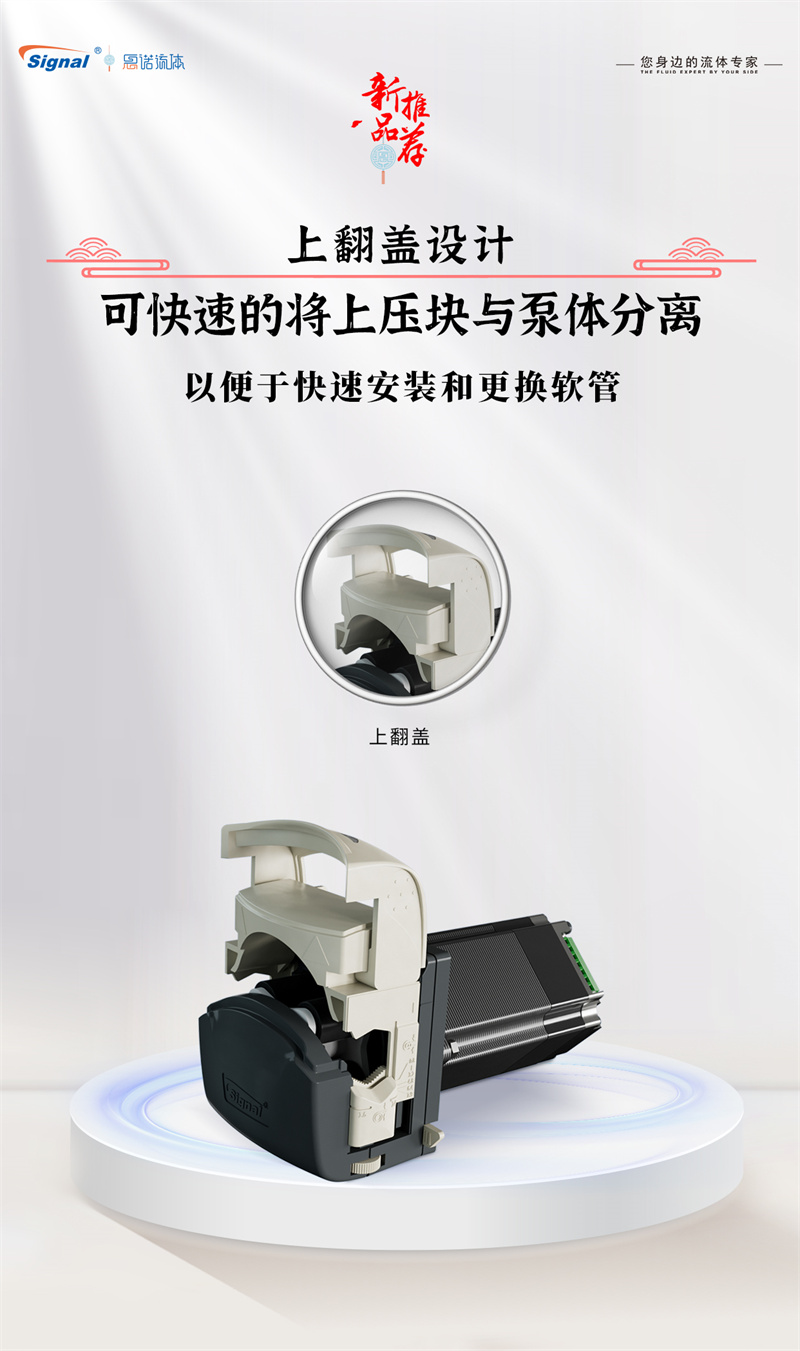 3.?上翻蓋設(shè)計(jì),可快速的將上壓塊與泵體分離,簡(jiǎn)化了軟管的安裝和更換流程,顯著提升維護(hù)效率。